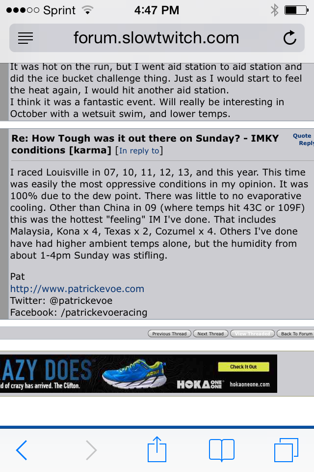 10. Conditions were very difficult, not only by Louisville standards, but for any Ironman.  Consider this post on SlowTwitch by 3rd place pro, Patrick Evoe: EVOEQuote