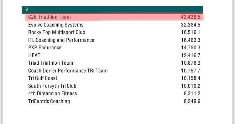 We knew we had a great group of people on our roster, but Sunday in Chattanooga they also showed it on the course by bringing home an Ironman TriClub title for Ironman 70.3 Chattanooga. C26 Triathlon won the Division V crown with 43,436.5 points, which was the second highest overall total of 200 competing triathlon teams, below only the local Chattanooga Triathlon Club.