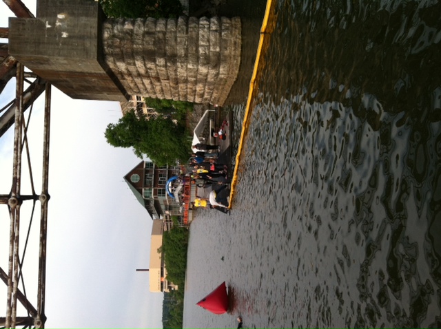 The course itself is all downstream, but it’s not “straight.” There is plenty of river space, and I remember this being almost a completely clean swim with regard to body contact, but my advice (even though it may be tempting to find a “better line”) would be stay as close to the buoys as possible.