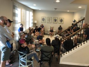After dinner, Coach Robbie takes the stage as we sit around on every chair they can find and jam into his living room. As you can see to the left, I’ve yet to figure out a perfect angle for a group picture, but I’m getting close.